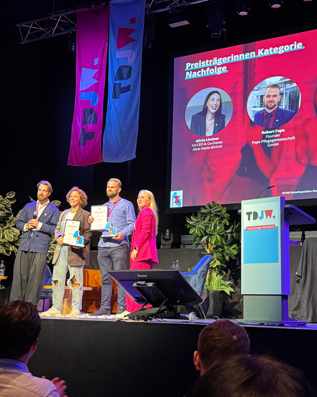 Geschäftsführer Robert Pape wurde im Rahmen der Initiative „Jung & Mutig – 4x4 unter 40“ von den Wirtschaftsjunioren Deutschland (WJD) als „Zukunftsmacher“ in der Kategorie Nachfolge ausgezeichnet. Die Auszeichnung würdigt unternehmerische Weitsicht, Innovationskraft und soziale Verantwortung bei der erfolgreichen Weiterentwicklung eines Unternehmens. Robert Pape steht dabei stellvertretend für das gesamte Team der Pflegegemeinschaft, das Tag und Nacht mit großem Engagement pflegebedürftige Menschen versorgt, Angehörige unterstützt und neue Wege in der Pflege beschreitet.