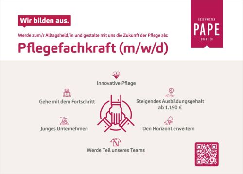 Ab 1.10.2022 sind wir dein Praxispartner für die generlistische Ausbildung zur Pflegefachkraft oder zum Pflegefachmann. Du wirst von unserer motivierten Praxisanleiterin bei deiner Ausbildung unterstützt und gefördert. Lerne unser therapeutisches Konzept und unsere wertschätzende Pflege kennen. Bei uns arbeitest und lernst du in einem jungen dynamischen Team und mit modernen Medien. Digitales Arbeiten gehört bei uns zum Alltag. Lerne bei uns, wie respektvolle Pflege aussieht und wie du den Alltag unserer Senioren gestalten kannst. Unser Motto ist Lebe dein Leben. Wir wollen, dass unsere Senioren sich wohl fühlen und das Leben genießen. Du kannst deinen Beitrag dazu leisten und die Pflege von Morgen mitgehalten. Bewirb dich Jetzt auch www.geschwister-pape.de/karriere